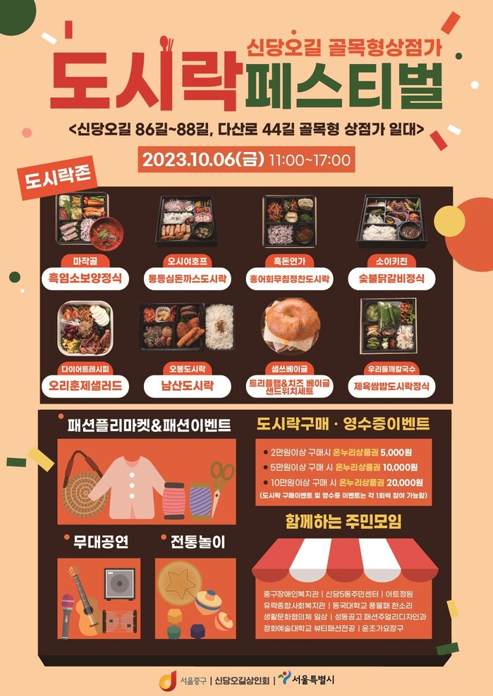 그간의 성과를 바탕으로 구는 '신당오길 도시락 로드' 를 출시한다. 6일 오전 11시~오후 5시 신당오길 골목형상점가 일대(퇴계로 88길~퇴계로 86길)에서는 ‘도시락 페스티벌’이 열려 새로 개발된 도시락 메뉴가 대중에 선 뵌다. 행사장 방문객은 이날 도시락 2개를 구매하면 온누리 상품권 5000원권을 증정받을 수 있다.