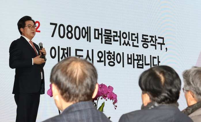 | ▲ 박일하 구청장이 '2025년 신년인사회'에서 올해 주요사업에 대해 설명하고 있다. (사진=동작구청 제공) |