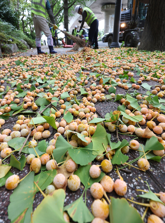 30일 오전 부산시 부산진구 백양대로 일원에서 구청 공원녹지과 관계자들이 은행 열매 낙과로 인한 악취와 보행 불편을 해소하기 위해 진동수확기를 활용, 채취작업을 하고 있다.