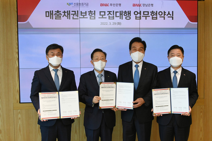 [시민일보 = 여영준 기자] BNK부산은행은 29일 지역 중소기업 부실채권에 따른 도산방지 및 경영안정성을 지원하기 위해 신용보증기금과 ‘매출채권보험 모집 업무협약’을 체결했다고 밝혔다.