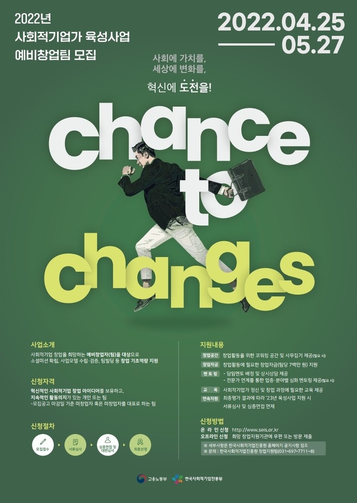 한국사회적기업진흥원은 사업 실현 가능성, 창업 아이템 등을 고려해 서류 심사와 심층면접, 대면 심사를 거쳐 총 9팀을 선발할 예정이며, 오는 6월30일 최종결과가 개별 통보된다.