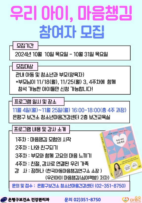 [시민일보 = 이대우 기자] 은평구(구청장 김미경)는 오는 31일까지 관내 아동·청소년과 부모 또는 양육자 대상 ‘우리아이, 마음챙김’ 프로그램 참가자를 모집한다고 밝혔다.