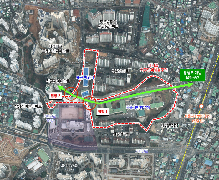 현재 신림선 병무청역 개통으로 병무청 부지는 일부 개방됐으나, 인접한 국방부 부지(해군 폐관사)는 여전히 통행이 제한돼 주민 불편이 이어지고 있다.