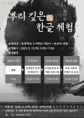 청원도서관은 세종대왕 탄신일(5월 15일)을 기념해 ‘세종대왕의 발자취를 찾아서, 언어 탐방기’를 주제로 삼고, ‘뿌리 깊은 한글 체험’코스를 운영한다.
