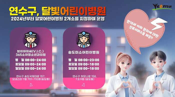 지난 2024년 4월 연수구 최초로 지정된 병원인 ‘브이아이씨(V.I.C) 365소아청소년과의원’에 이어 송도동 소재 ‘송도미소어린이병원’을 추가로 지정해 달빛어린이병원은 총 2곳이 운영되고 있다.