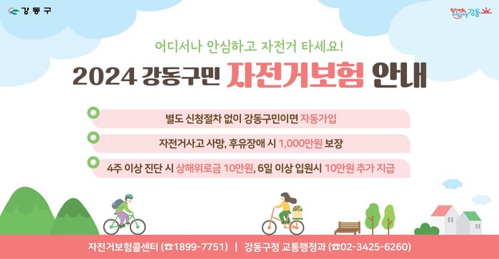 ‘강동구민 자전거보험’은 강동구에 주민등록이 되어 있는 구민이면 별도의 가입 절차 없이 자동으로 가입되며, 국내 어디에서든 ▲자전거를 직접 운전하던 중에 일어난 사고 ▲자전거를 운전하지 않고 탑승 중에 일어난 사고 ▲통행(보행) 중 자전거로부터 입은 사고로 인해 4주 이상의 진단을 받을 경우 보장받을 수 있다.