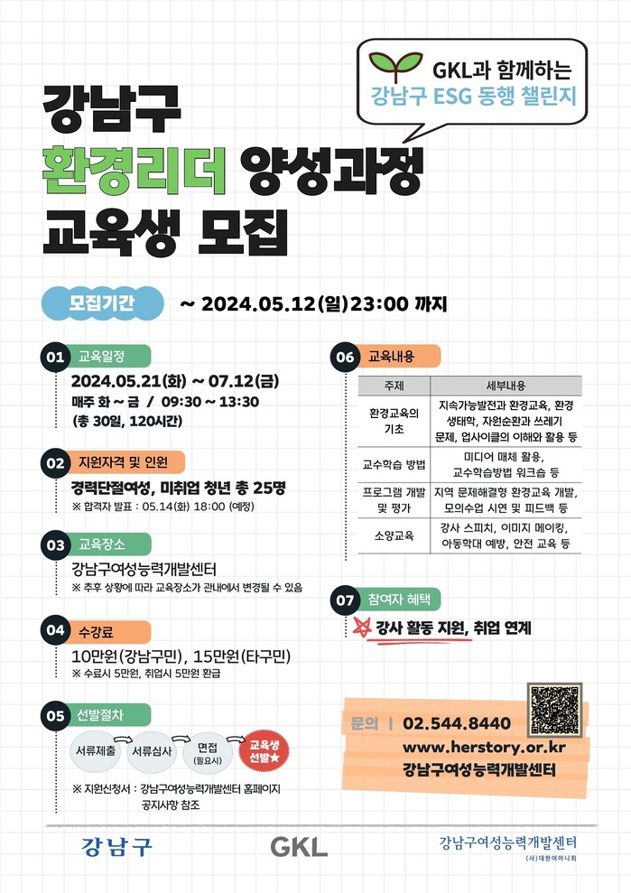 환경 리더 양성 교육은 강남구여성능력개발센터에서 진행된다. 신규반과 경력반으로 나눠 진행되며, 5월12일까지 신규반 교육 대상자 25명을 모집한다. 5월21일~7월12일 매주 화~금요일(오전 9시30분~오후 1시30분) 총 120시간을 교육한다. 경력반은 지난해 수료한 강사를 대상으로 총 30시간 역량 강화 교육을 진행한다. 교육 수강료는 10만 원(구민이 아닌 경우 15만원)이며 수료와 취업 시 각각 5만 원씩 10만 원을 모두 환급해준다. 교육 신청 및 문의는 센터로 연락하면 된다.