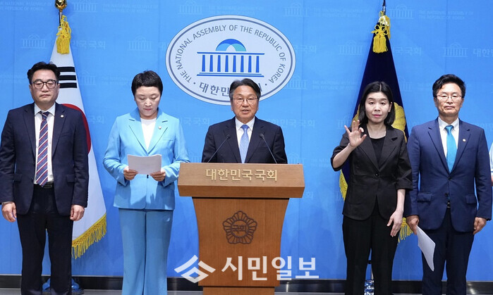 | ▲ 강기정 광주광역시장이 10일 서울 여의도 국회 소통관에서 정진욱·전진숙 국회의원 등과 기자회견을 열고 공공배달앱 활성화를 위한 지자체 국비 지원 등을 촉구하고 있다. /광주광역시 제공 |