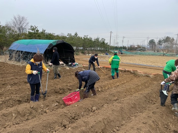경기 수원시 권선구 입북동 새마을협의회는 23일 우리동네 공동경작 '아낌없이 주는 텃밭' 운영의 일환으로 어려운 이웃돕기를 위한 사랑의 감자 심기를 입북동 공동텃밭(입북동 406)에서 진행했다. 사진은 이날 씨감자를 파종하고 있는 모습. (사진제공=수원시청)