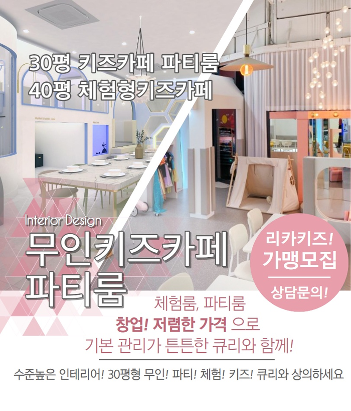 키즈카페 창업 인테리어 브랜드 '큐리'는 신규 가맹점주를 대상으로 무인 리카키즈룸, 체험형, 대형키즈파크등 관련한 프로모션을 진행한다고 3일 밝혔다.