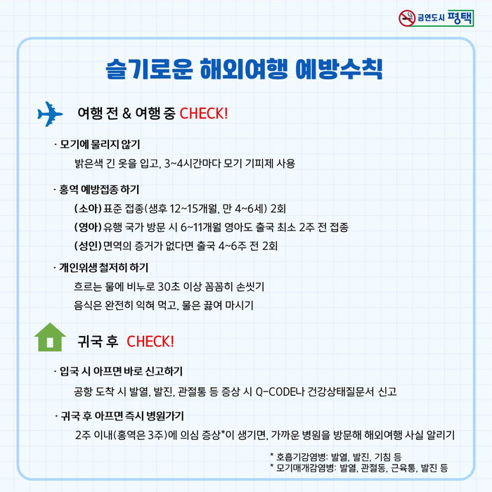 평택보건소 관계자는 “해외 유입 감염병은 개인의 예방수칙 준수 여부가 지역사회 전파를 막는 핵심”이라며 “출국 전 예방접종 확인과 귀국 후 신속한 신고를 반드시 실천해 달라”고 강조했다.