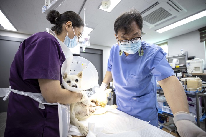 | ▲ 용인시 동물보호센터에서 보호중인 유기동물이 수의사로부터 진료를 받고 있다 |