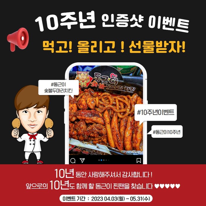 동근이숯불두마리치킨이 창립 10주년을 기념해 이번 달 30일까지 '10주년 감사 이벤트'를 실시한다고 밝혔다.