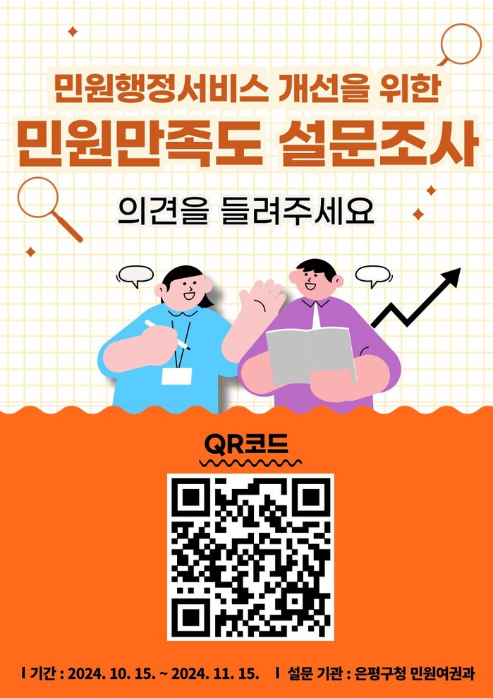 [시민일보 = 이대우 기자] 은평구(구청장 김미경)는 오는 15일부터 내달 15일까지 2024년 하반기 민원서비스 만족도 설문조사를 실시한다고 밝혔다.