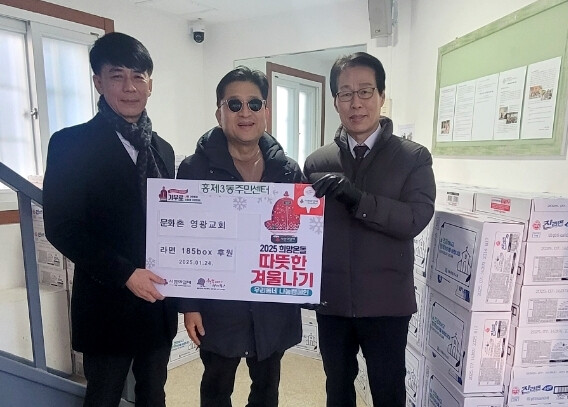 [시민일보 = 이대우 기자] 서대문구 홍제3동(동장 이현석)은 관내 소재한 문화촌영광교회(담임목사 양재준)가 최근 라면 185박스(450만 원 상당)를 ‘2025 희망온돌 따뜻한 겨울나기’ 물품으로 기부해 주위를 훈훈하게 했다고 밝혔다.