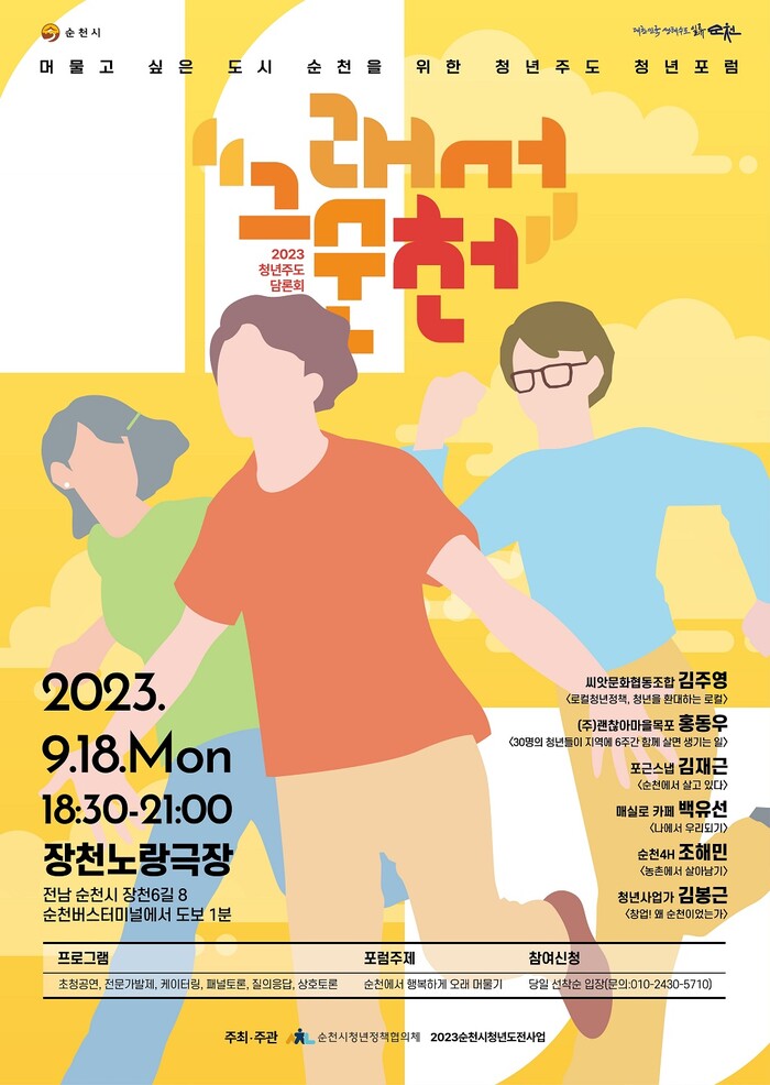 [순천=이문석 기자] 전남 순천시가 18일 오후 6시30분에 장천노랑극장에서 청년정책협의체 주도로 '청년포럼 그래서 순천!'을 개최한다.
