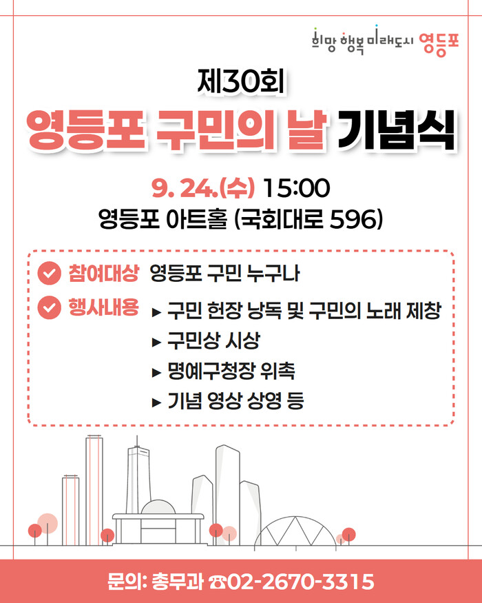 자세한 내용은 구 누리집(홈페이지) ‘우리구소식’ 게시판 또는 영등포 소식지 9월호에서 확인할 수 있으며, 문의는 구청 총무과로 하면 된다.