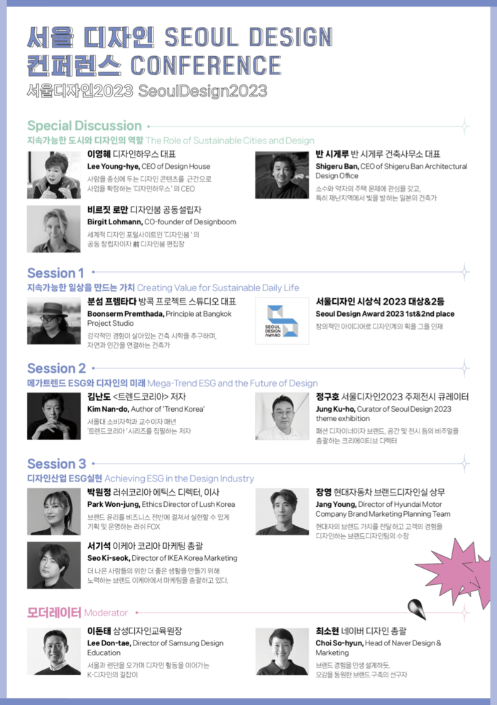 ‘서울디자인 2023 컨퍼런스’는 ESG와 디자인의 미래에 대한 국내외 연사들의 의견과 K-디자인 및 세계 디자인 트렌드를 직·간접적으로 경험할 수 있는 자리가 될 예정이다. 특히 트렌드 분석가 김난도 교수와 세계적인 건축가 반 시게루 등 세계적인 전문가가 말하는 지속가능한 도시와 디자인의 역할에 대해 다양한 이야기를 들을 수 있다.