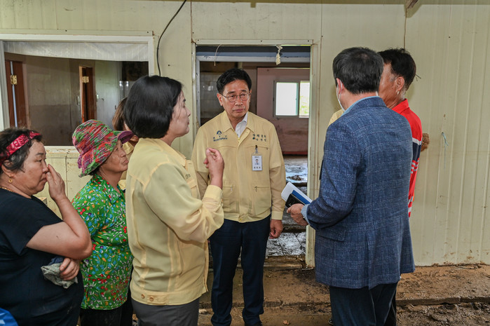 경기 양평군 옥천면은 5일 집중호우로 침수된 옥천1리의 가구를 찾아 긴급 수해복구 작업을 실시했다. 이날 복구작업은 61여단 108기보대 소속 장병의 대민지원 협조를 받아 집안내 토사를 치우고 대형폐기물을 옮기는 등 피해 복구를 위해 최선을 다했다. 사진은 복구작업에 참여한 전진선 군수(왼쪽 네 번째)가 관계자들과 대화를 하고 있는 모습. (사진제공=양평군청)