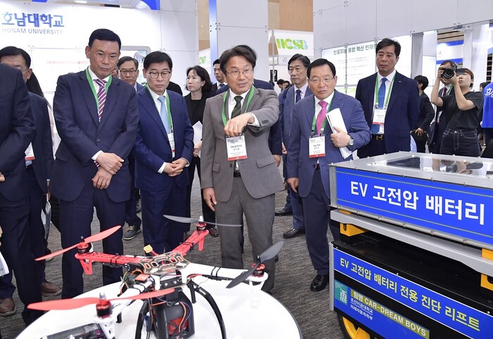 | ▲ 강기정 광주광역시장이 13일 오전 서구 김대중컨벤션센터에서 열린 '2023 국제중소기업협의회 세계대회 개막식'에 참석해 행사를 마친 뒤 기업 전시관을 둘러보고 있다./광주광역시 제공 |