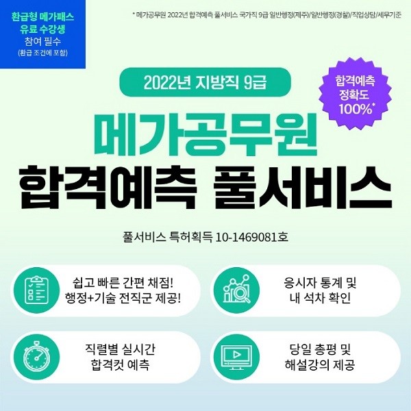 메가공무원 합격예측 풀서비스는 2022 9급 지방직 시험 행정직군 및 기술직군에 응시한 수험생이면 누구나 무료로 이용할 수 있다. 메가공무원 합격예측 풀서비스와 관련된 자세한 내용은 메가공무원 홈페이지에서 확인할 수 있다.