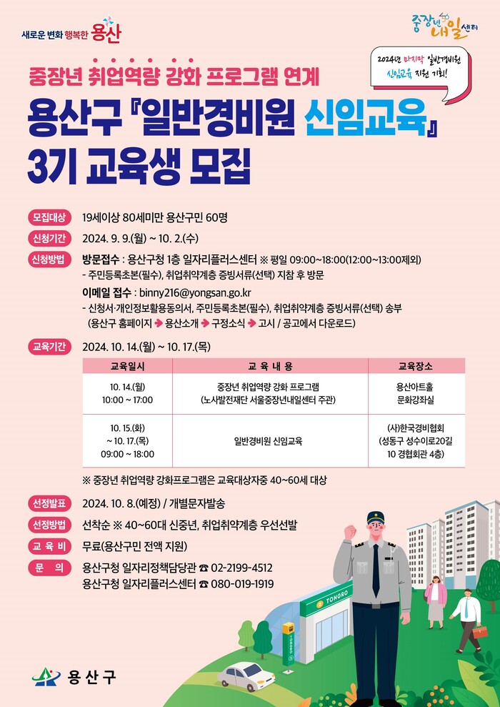 [시민일보 = 문민호 기자] 서울 용산구(구청장 박희영)가 취업역량 강화프로그램과 연계한 '2024년 일반경비원 신임교육 3기' 참여자를 모집한다.