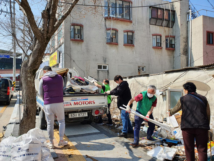 경기 동두천시 불현동 새마을지도자 및 부녀회는 최근 환경정비 봉사를 실시해 광암동 모처에 쌓여 있는 생활폐기물을 정리했다. 사진은 이날 회원들이 투기된 생활폐기물을 수거하고 있는 모습. (사진제공=동두천시청)