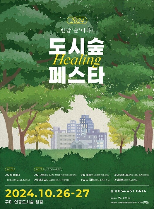 [구미=박병상 기자] 구미시는 오는 26일부터 이틀간 인동도시숲 일원에서 ‘2024 도시숲 힐링페스타’를 개최한다. 이번 행사는 도시숲이 지닌 상징성과 구미시의 도시 자원을 활용해 다양한 체험 프로그램과 예술 전시를 선보인다.