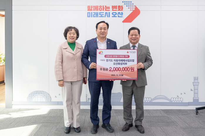 경기 오산시가 지난 22일 경기도 자동차매매사업조합 오산화성지부로부터 지역내 취약계층 지원을 위한 성금 200만원을 기탁받았다. 사진은 기탁식에서 이권재 시장(가운데)이 관계자들과 기념 촬영을 하는 모습. (사진=오산시청 제공)