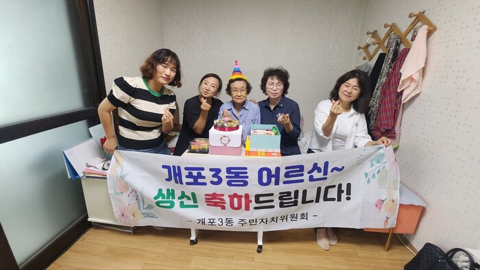 [시민일보 = 이대우 기자] 서울 강남구(구청장 조성명) 개포3동이 관내 저소득 무연고 홀몸 어르신을 대상으로 생신 잔치를 열어드리고 안부 확인 및 문화공연을 선보이는 ‘어르신~ 생신 축하드립니다!’ 사업을 11월까지 진행한다.
