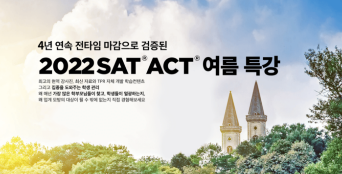 2022 여름특강은 개인별 일정에 맞춘 주차 별 등록이 가능하며, 평일 무료상담 예약 진행 후 당일 등록 시 5% 할인 혜택을 제공한다. 기존에 다른 교육기관에서 SAT 및 ACT 수업을 수강한 학생이 프린스턴 리뷰 학원으로 변경할 경우, 수강료 할인 및 교재 무료 증정 혜택도 제공한다.