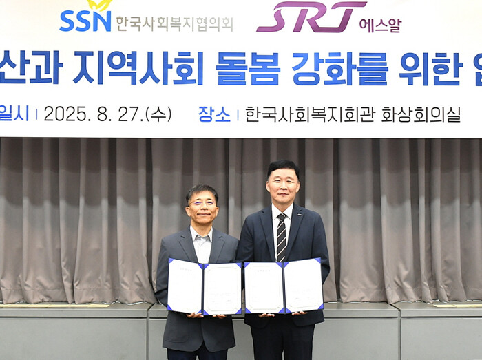 | 한국사회복지협의회 조남권 사무총장(왼쪽)과 주식회사 에스알 황현주 전략기획본부장이 포즈를 취하고 있다. |