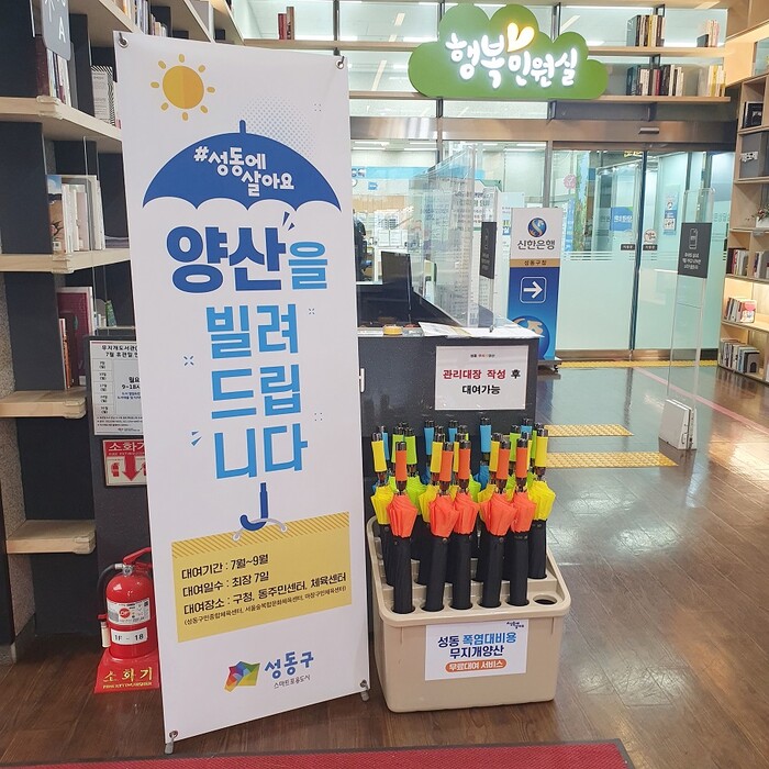 [시민일보 = 홍덕표 기자] 서울 성동구(구청장 정원오)가 본격적인 폭염을 대비하여 주민들이 건강하고 안전하게 여름을 보낼 수 있도록 오는 9월 말까지 양산을 무료로 대여한다.