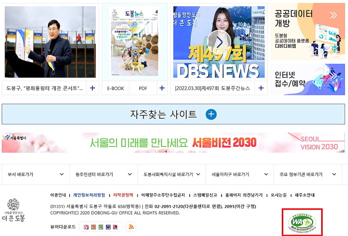 | ▲ 도봉구 대표 홈페이지 메인 페이지 웹접근성 품질마크 캡처본.(사진 속 우측 하단 빨간 네모 박스 안 웹접근성 품질마크) (사진제공=도봉구청) |