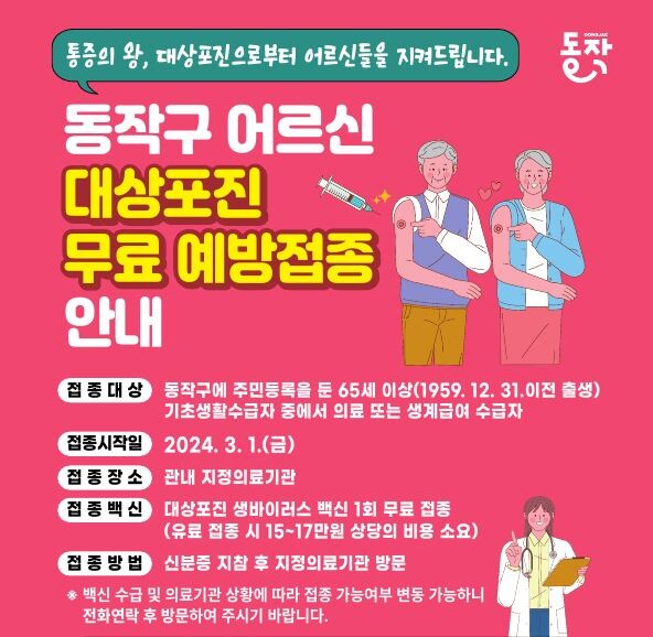 예방접종 대상은 65세 이상(1959.12.31. 이전 출생자) 기초생활수급자 중 의료 또는 생계 수급자로, 접종일 기준 동작구에 주민등록을 두고 있는 구민이다. 단, 과거 대상포진 예방접종 이력이 있는 경우는 대상에서 제외된다.