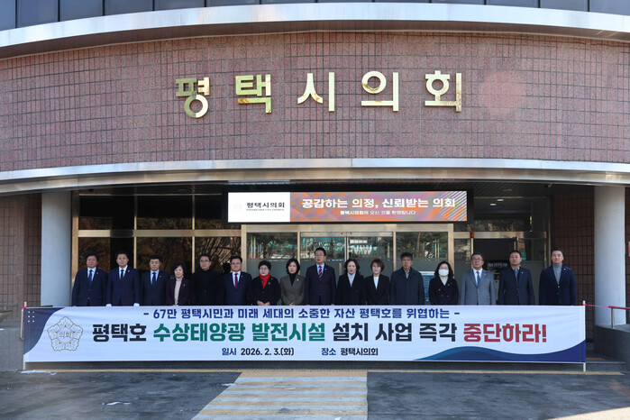 또한 “평택시의회 의원 일동은 평택호를 지켜야 할 책무를 가지고 졸속적이고 일방적으로 추진되고 있는 평택호 수상태양광 발전시설 설치 사업을 즉각 중단할 것 요구한다”고 밝혔다.