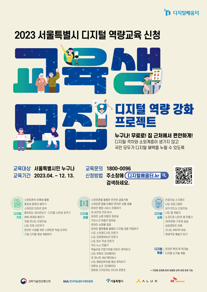 디지털 역량강화를 목표로 기초, 생활, 심화, 특별교육 등 수준별 맞춤형 교육으로 진행되며 시민 누구나, 일상생활에 필요한 기본역량부터 심화 교육까지 집 근처에서 편하게 받을 수 있다.