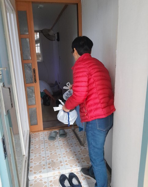 | ▲ 강북구 우리동네돌봄단이 고독사 위험가구에 방문해서 사랑의 성품을 전달하고 있다. (사진=강북구청 제공) |