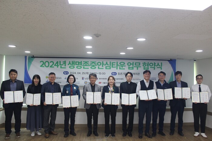 | ▲ 생명존중안심타운 업무 협약식에 참석한 관계자들이 협약서를 들고 기념촬영을 하고 있다. (사진=강서구청 제공) |