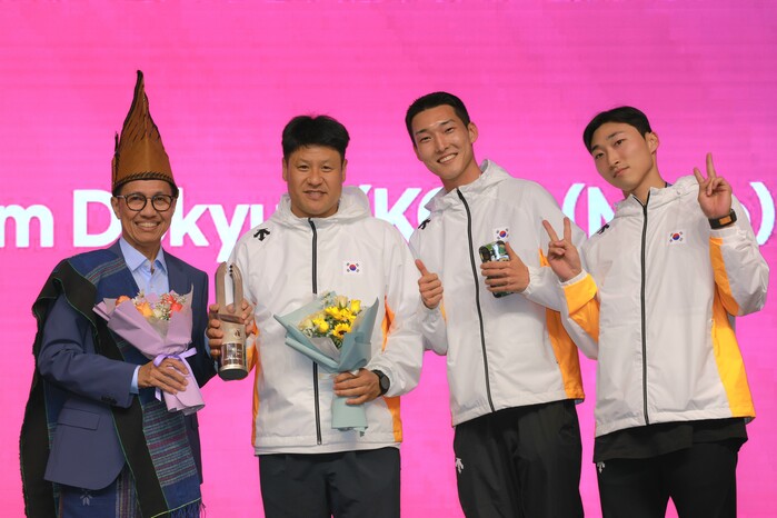 | ▲ 사진설명=용인특례시 직장운동경기부 육상팀 우상혁(오른쪽 두번째), 유규민(오른쪽 첫번째) 선수와 김도균(왼쪽 두번째)감독이 2025 구미 아시아육상경기 선수권대회에서 메달을 획득하고 기념촬영하고 있다 |