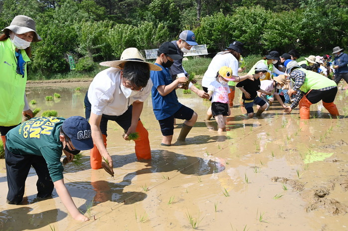 경기 수원시는 지난 28일 권선구 호매실동 친환경 논 체험장(개구리논)에서 시민과 함께하는 ‘손 모내기’ 체험 행사를 열고 손으로 직접 모(추청벼)를 심는 전통 모내기를 했다. 사진은 유문종 수원시 제2부시장(왼쪽 세 번째)이 어린이들과 함께 손 모내기를 하고 있는 모습. (사진제공=수원시청)