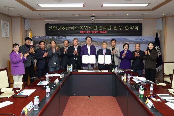 [신안=황승순 기자]신안군(군수 박우량)은 28일 군청에서 한국수목원정원관리원(이하 한수정)과 정원문화 활성화 및 공동 발전을 위한 업무협약을 체결했다.
