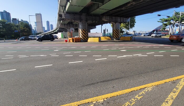 | ▲ 한강대교남단교차로 노량진역방향 컬러 유도선 설치사진. (사진=동작구청 제공) |
