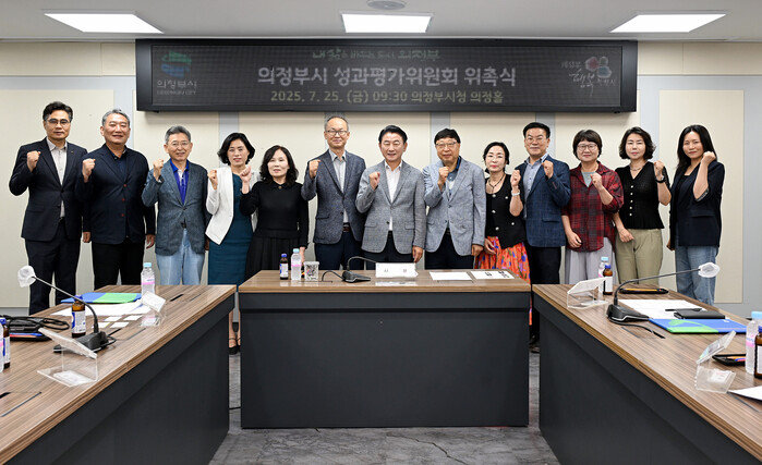 경기 의정부시가 최근 시청 의정홀에서 ‘제7대 성과평가위원 위촉식’을 열고 민간 전문가 12명에게 위촉장을 수여했다. 이번에 위촉된 위원들은 행정, 복지, 도시 등 주요 분야의 민간 전문가로 구성됐다. 사진은 김동근 시장(가운데)이 위촉 위원들과 기념 촬영을 하는 모습. (사진=의정부시청 제공)