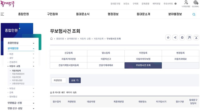 스마트 서치는 동대문구가 서울시 자치구 최초로 도입한 자동차 무보험 운행이력 확인 시스템으로, 구 누리집/ 종합민원 / 자동차 · 교통 / ‘무보험 운행 사건 조회’에서 본인인증 후 차량 번호만 입력하면 무보험 운행 적발 여부를 쉽게 확인할 수 있다.