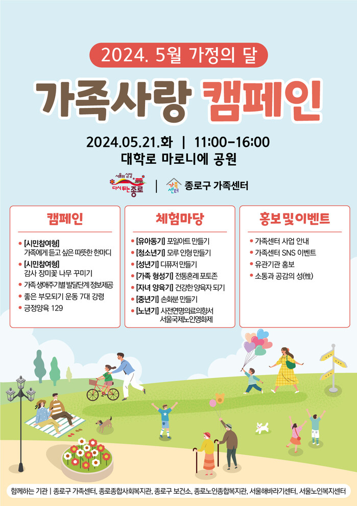 먼저 ‘2024 가족사랑 캠페인’은 21일 오전 11시~ 오후 4시 마로니에 공원(대학로 104)에서 열린다.