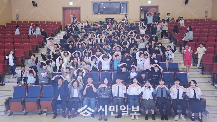 | ▲ 지난 15일 오후 7시 꿈누리센터에서 열린 ‘이순신 義기양양 렉쳐콘서트’ 를 관람하기 위해 착석한 해남동초등학교 3학년 학생 및 학부모, 교육청 관계자 등 하트 퍼포먼스 자료사진 / 해남교육지원청 제공 |