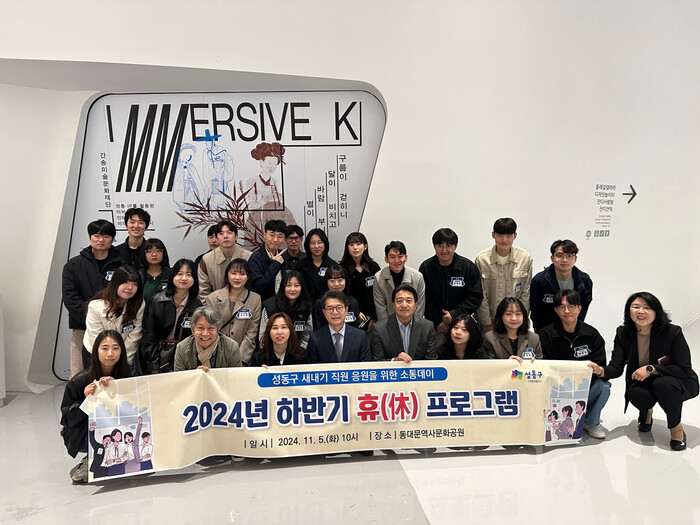 | ▲ 지난 11월 성동구 새내기 직원을 위한 ‘하반기 휴(休) 프로그램’에서 정원오 구청장(맨 아랫줄 가운데)이 직원들과 기념 촬영을 하고 있다. (사진=성동구청 제공) |