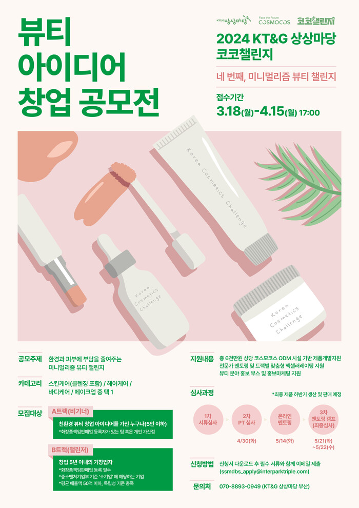 [시민일보 = 여영준 기자] KT&G 상상마당이 친환경 뷰티 분야의 창업지원을 위해 ‘2024 KT&G 상상마당 코코챌린지(Korea Cosmetics Challenge)’ 참가자를 오는 4월15일까지 공개모집한다.