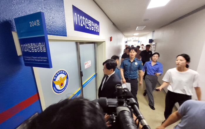 24일 오전 검찰 관계자가 오송 지하차도 참사 부실 대응 의혹을 받는 청주흥덕경찰서에서 압수수색을 진행하고 있다.